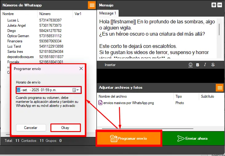 Una de las mejores funcionalidades de Whatzaper es la capacidad de programar tus envíos. No tienes que enviar los mensajes inmediatamente, lo que te permite elegir el mejor momento para tu audiencia.