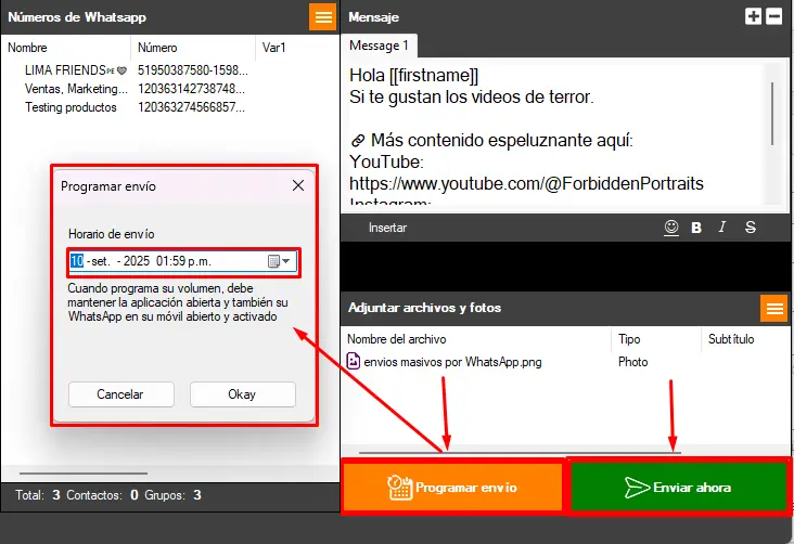 - Programar envíos por fecha y hora.