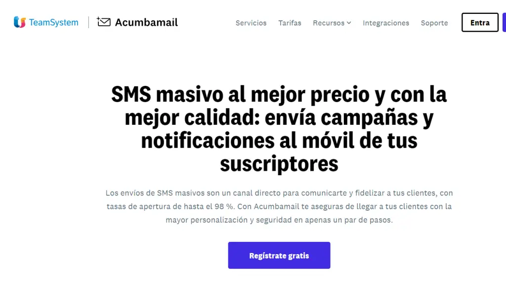 Acumbamail también ofrece una prueba gratis que incluye 5 SMS de regalo para que puedas conocer el funcionamiento de la plataforma. Además, cuentan con API SMS para que puedas enviar mensajes directamente desde tu propio sistema, software o aplicación. La plataforma es intuitiva, fácil de usar y te permite ver estadísticas en tiempo real.