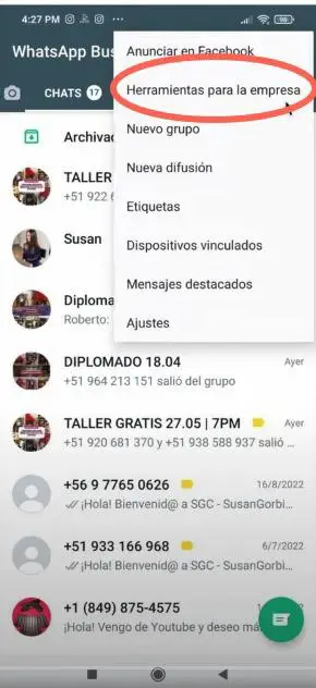 - Ve al menú superior derecho en tu bandeja de mensajes de Android o en la sección «Configuración» en iPhone. Luego, selecciona «Herramientas para empresas».