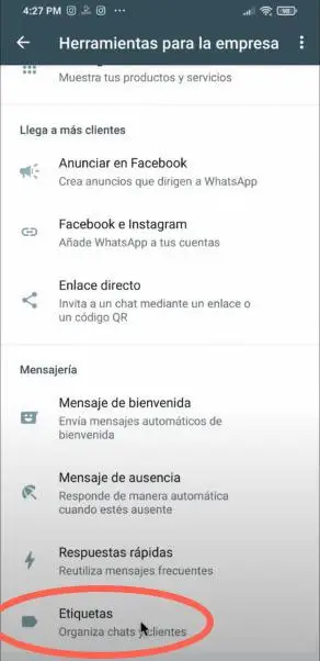 Para editar las etiquetas que has creado, vuelve a la opción «Herramientas para empresas» / «Etiquetas». Allí podrás ver y editar todas las categorías en cualquier momento. Puedes cambiar el nombre de la etiqueta o los chats que están dentro de ella, así como también modificar el color.